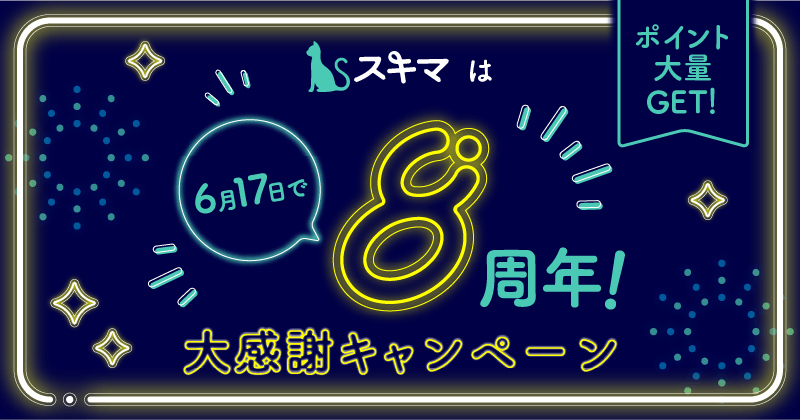 この度、「スキマ」をご利用いただいている皆様へ感謝の気持ちを込めて「8周年大感謝キャンペーン」と称しポイントが貯まる4つのイベントを6月1日より開催中です!