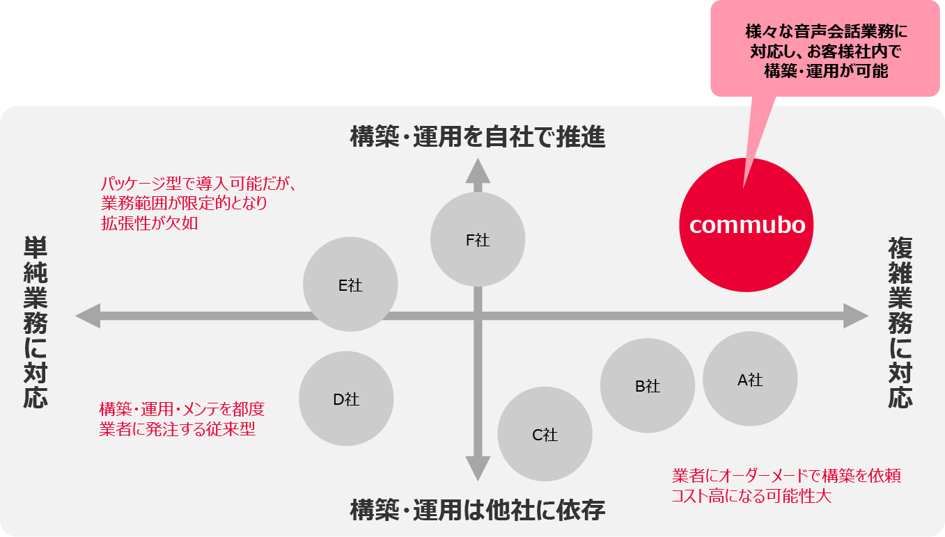 複雑な音声会話業務に対応可能なサービスをクラウドパッケージとして提供可能です。お客様社内での構築・運用が可能であり、DX内製化をご支援できます。また、提案から運用開始までワンストップでのサービス提供となるため、複雑業務に対応できるボイスボットの中でも、リーズナブルな価格で幅広い業務への適用のご相談から承ることが可能となります。