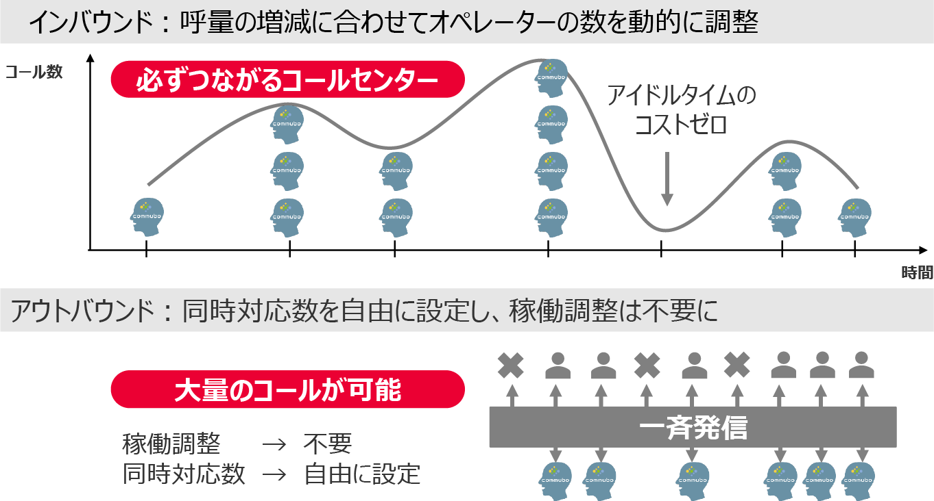インバウンドコールでは、入電数の増減に合わせ、必要なAIオペレーター数を自動的に調整。アウトバンドコールにおいては、担当者が架電する場合と異なり、同時対応数を設定するだけで稼働調整は不要となります。