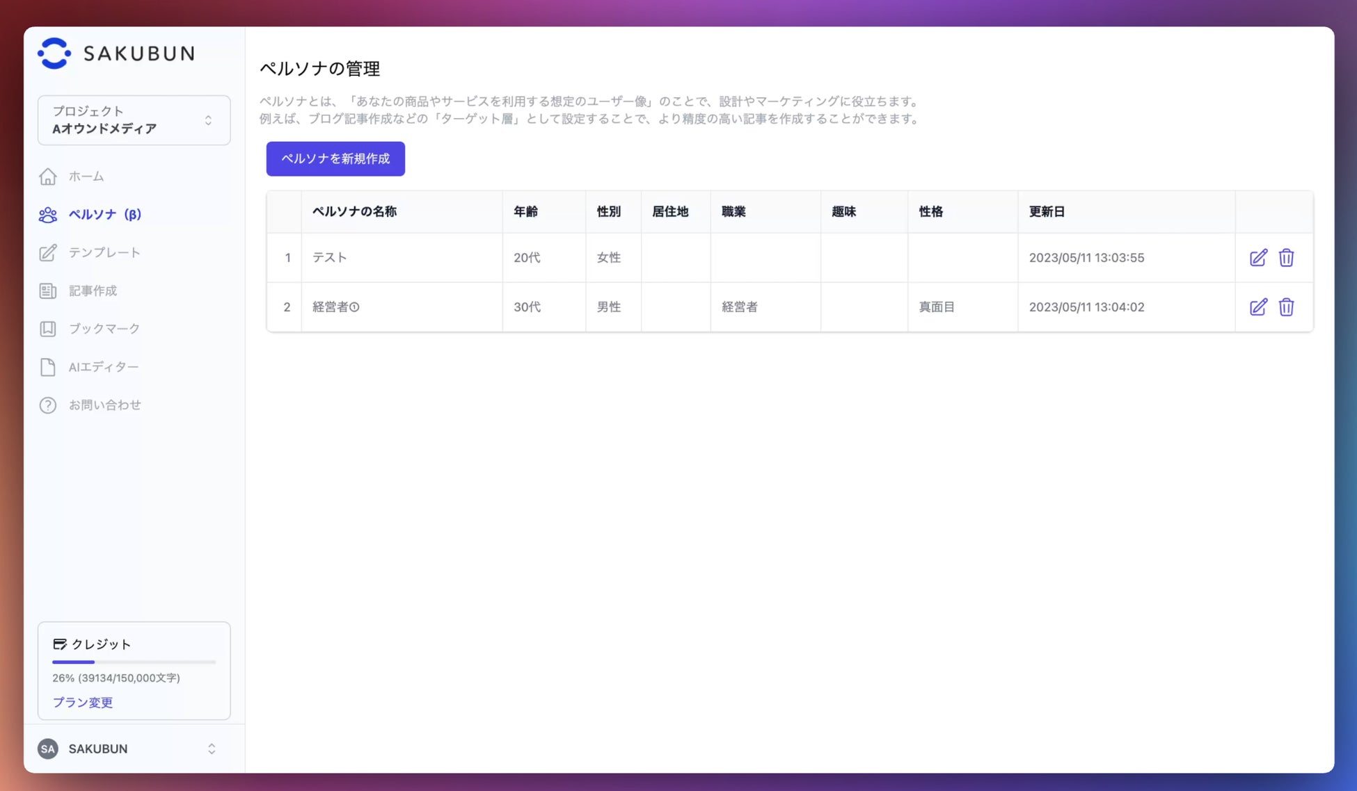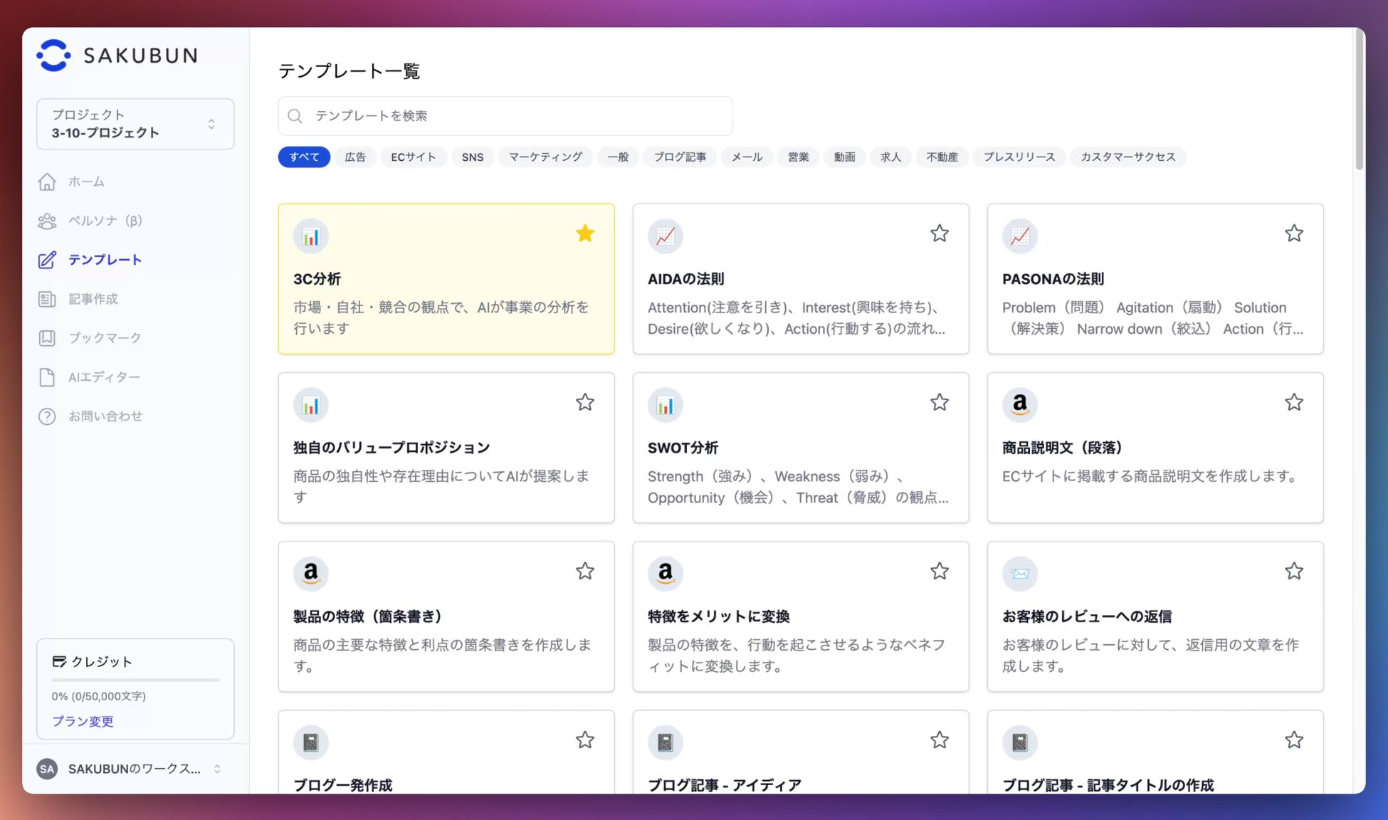 また、GPT-3.5/4を用いた50種類以上のテンプレート・ペルソナ設計などの機能もあり、より効率的に”コンテンツ制作”をすることも可能です。
