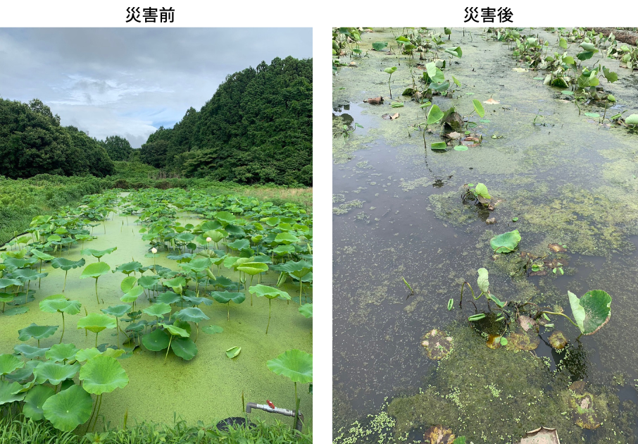 生産者の声:大雨の影響でレンコン畑が浸水してしまいました。出てきたばかりの新葉が水に浸かってしまったことで、本来であれば8月から1日160kgほど出荷できる予定だったレンコンの内最大5割程度が被害を受けています。
