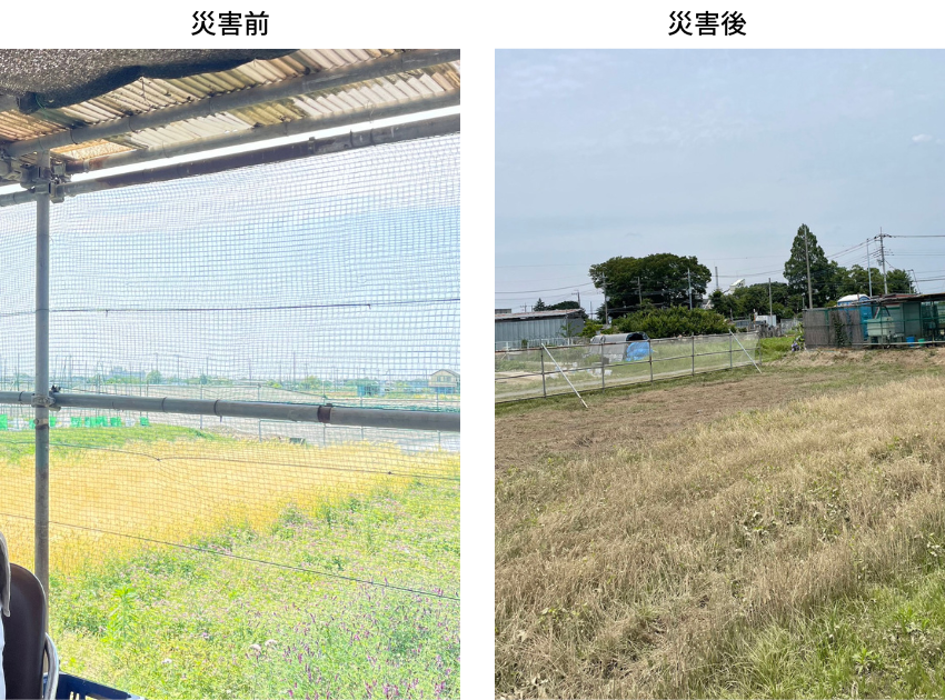 生産者の声:農園への浸水により栽培していたハーブや野菜の根がやられてしまい、6月に出荷する予定で栽培していた食材の7割が廃棄となってしまいました。農園だけでなく倉庫への浸水により資材や肥料なども多くは廃棄となってしまいました。