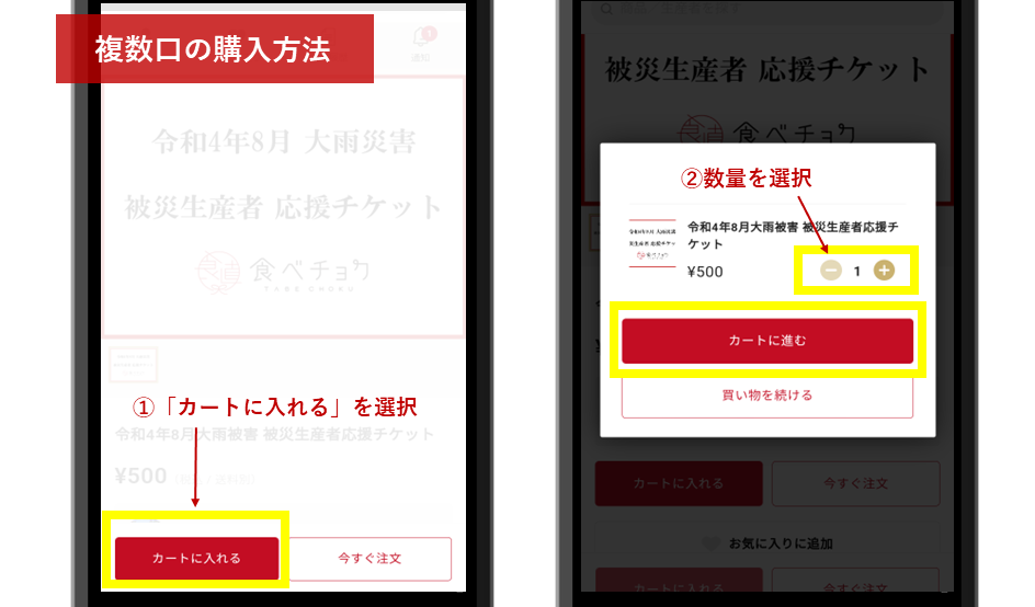 被災された生産者の中で販売する商品が無い方を優先し、1口500円・5,000円の応援チケットを販売します。