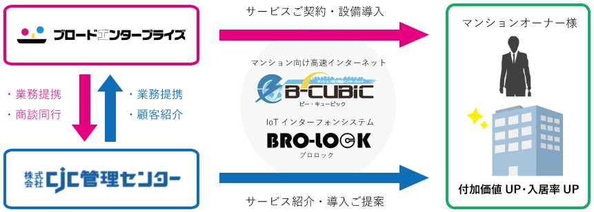 CJC管理センターが主たる事業とする賃貸物件管理事業にて、ブロードエンタープライズのマンション向け高速インターネット「B-CUBIC」及びIoTインターフォンシステム「BRO-LOCK」を、賃貸物件の所有者に導入提案を行います。なお、具体的な実施内容につきましては、今後、物件ごとにカスタマイズされた提案内容を、それぞれ個別に締結する契約書において詳細を定める予定です。
