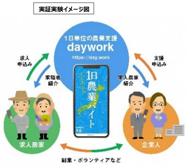 このような社会背景、課題を踏まえ、1日農業バイトアプリ「daywork」に法人向け利用機能※2を追加し、企業人による農作業参加を促進し、農業労働力確保と地域交流人口拡大を目指す実証実験を開始します。