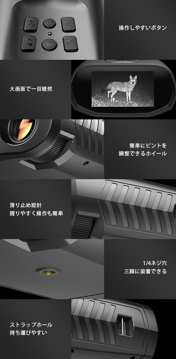 野生動物の観察、夜間の監視、災害救助、屋外探検、アウトドアやキャンプなど様々なシーンで大活躍。