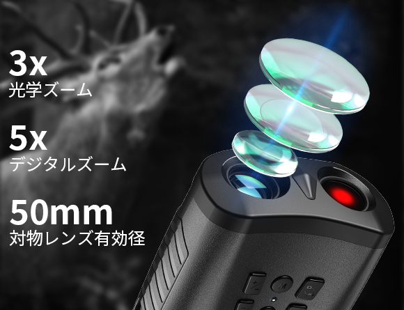 光学3倍レンズとデジタル5倍ズームを搭載し、最大15倍までズーム可能です。また、50mmの対物レンズ有効径と5段階の倍率調整を搭載し、より遠くまで鮮明に観察できます。