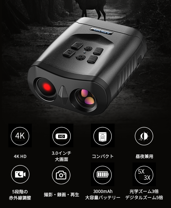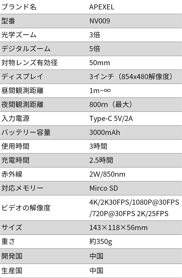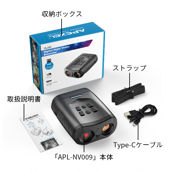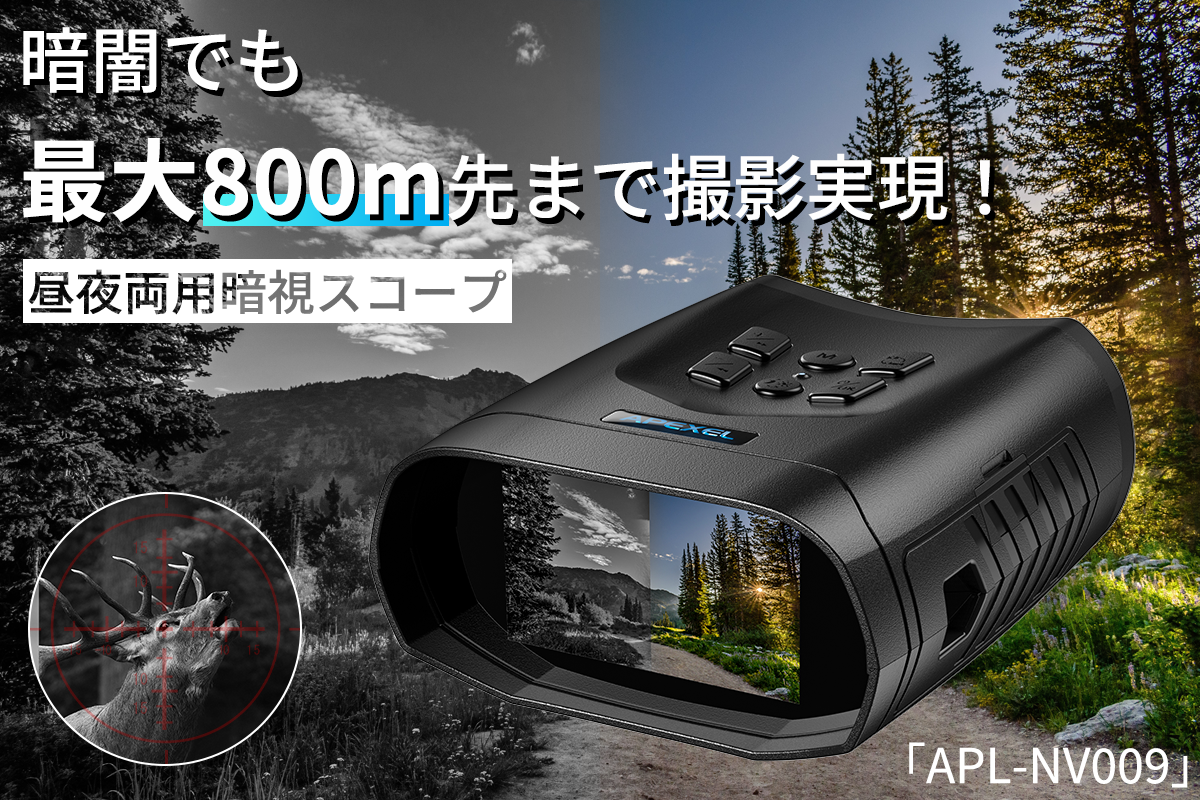 「APL-NV009」は昼夜問わず使える双眼鏡型暗視スコープです。暗闇の中でも最大800m先まで撮影・録画することが可能、5段階の赤外線で輝度を調整してハッキリ観察することが出来ます。レンズは3倍光学拡大、5倍デジタルズームが出来ます。
