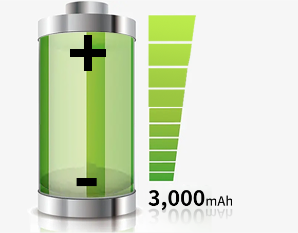 3000mAh大容量バッテリーが内蔵され、赤外線機能オンの場合は約6時間連続使用で、赤外線機能オフの場合は約16時間連続使用できます。