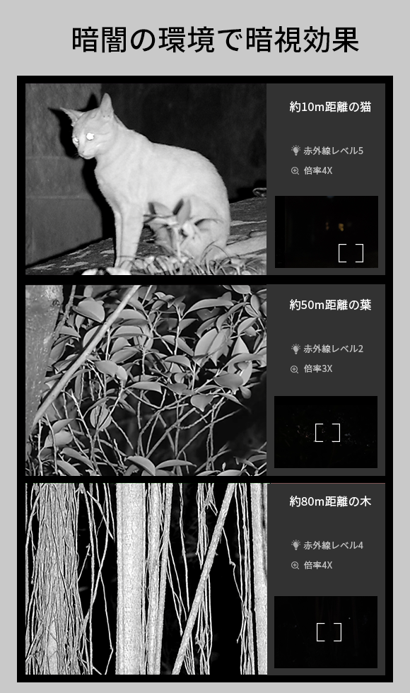 暗闇の中、最大約800m先まで観察できます。市販されている暗視スコープ300〜600m程度の暗視距離に比べ、「APL-NV009」は超低照度CMOSセンサーを搭載することで暗視距離が飛躍的に伸びました。