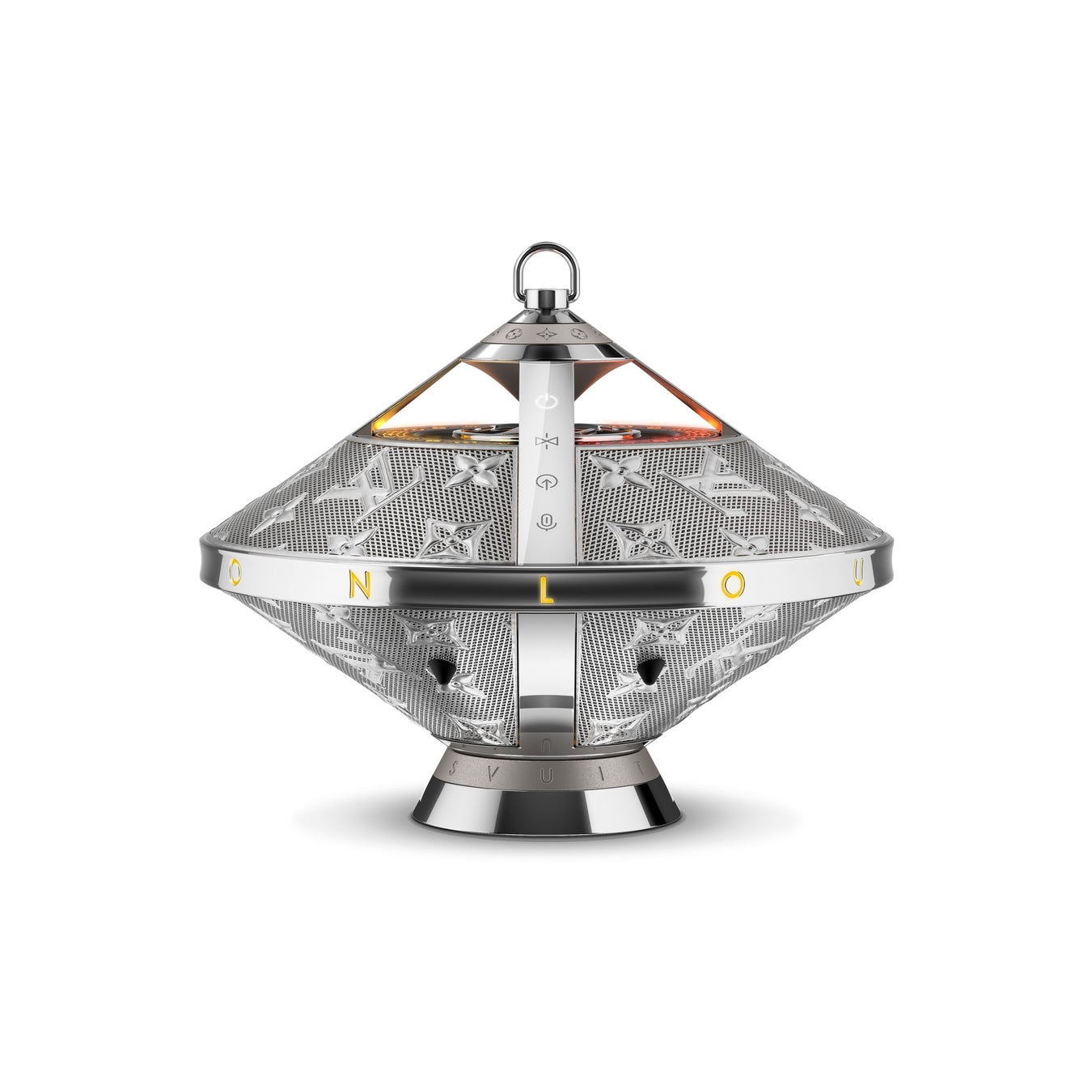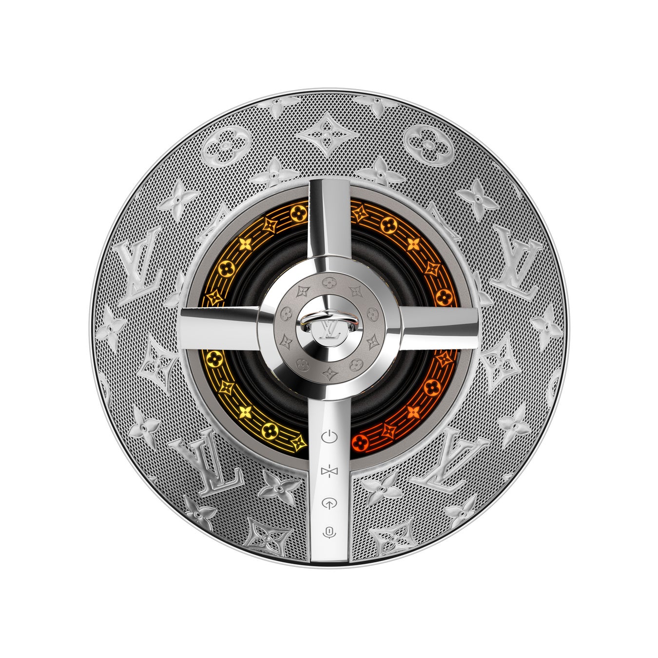 モノグラム·パターンをパーフォレーションとエンボス加工で表現したレザー、艶あり & 艶消し仕上げを施したステンレススティール、強化ガラス、LEDライトを組み合わせ、この上なくモダンで洗練されたデザインに仕上げまられています。装飾品としても、ライフスタイルのパートナーとしても相応しい、音楽を聴く喜びを広げ、ユニークかつさまざまな感覚で音楽を楽しめるアイテムです。
