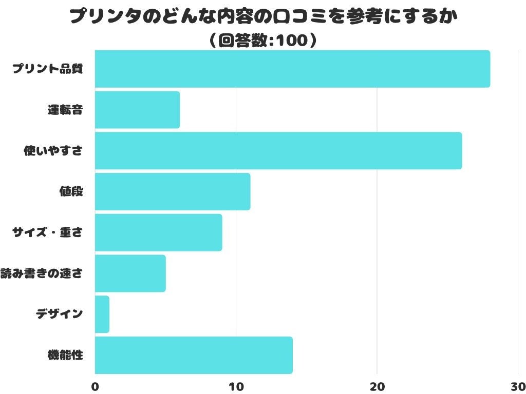 プリンタのどんな内容の口コミを参考にするかをアンケートにて調査したところ、1位は「プリント品質」でした。