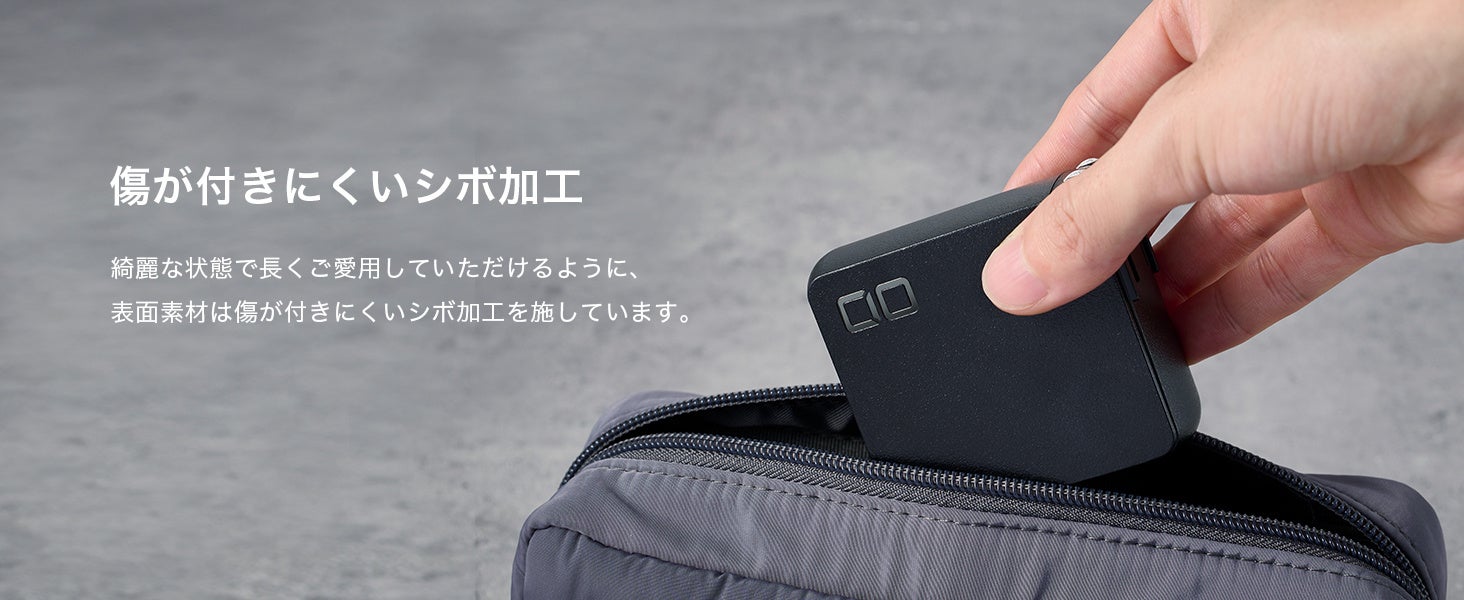ラウンドとエッジを組み合わせることで、デバイスとの相性を保ちながら、手に持ちやすいデザインに。ポート部分にはCIOの表現する「未来感」を表すコーポレートカラーのCIOパープルをアクセントに。側面にはCIOのロゴをアルミプレートで配置することで、高級感を演出しました。