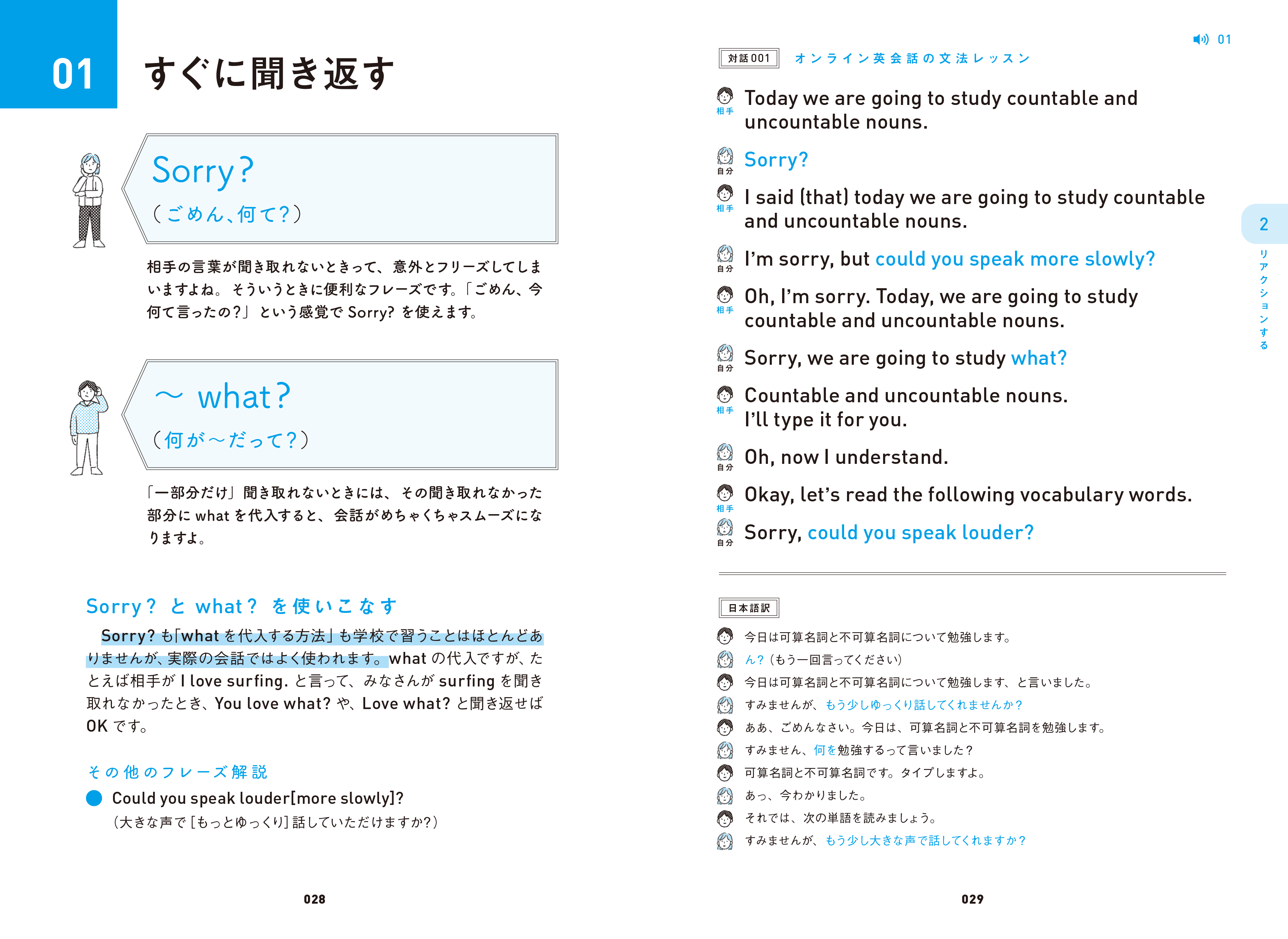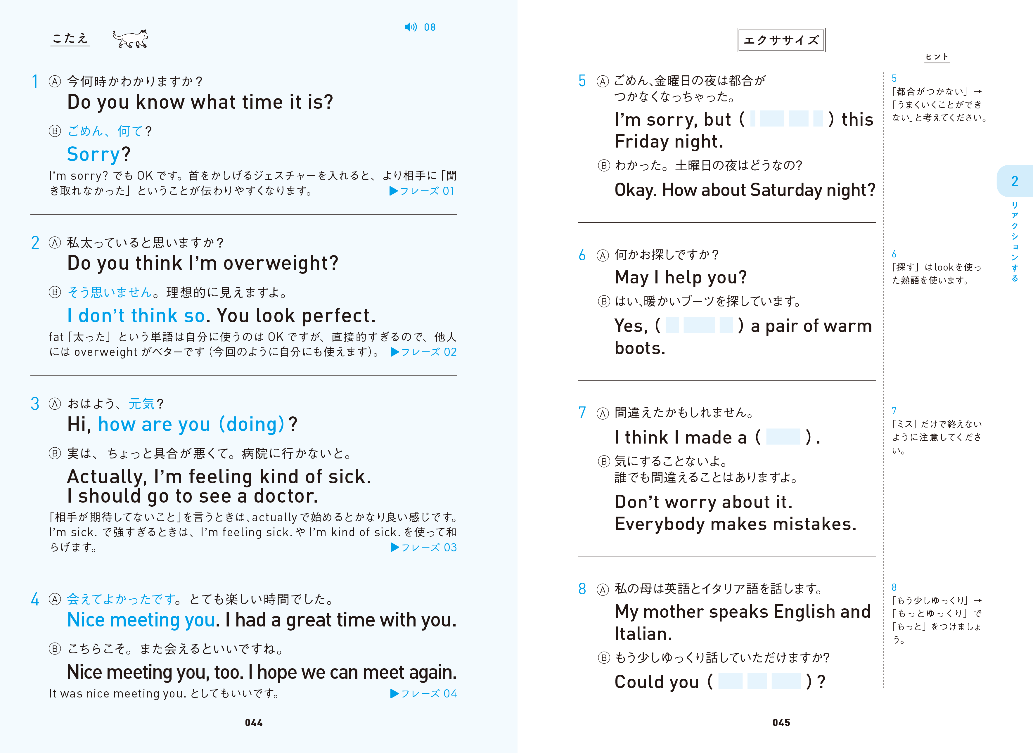 自然に口から出てくるまで覚えたいメインフレーズとその使い方のテクニックを43個紹介。状況をイメージしながら、覚えたフレーズが言えるかチェック。ダウンロードして聞く音声素材でリズムや表情も意識して、さらに実践力アップ。