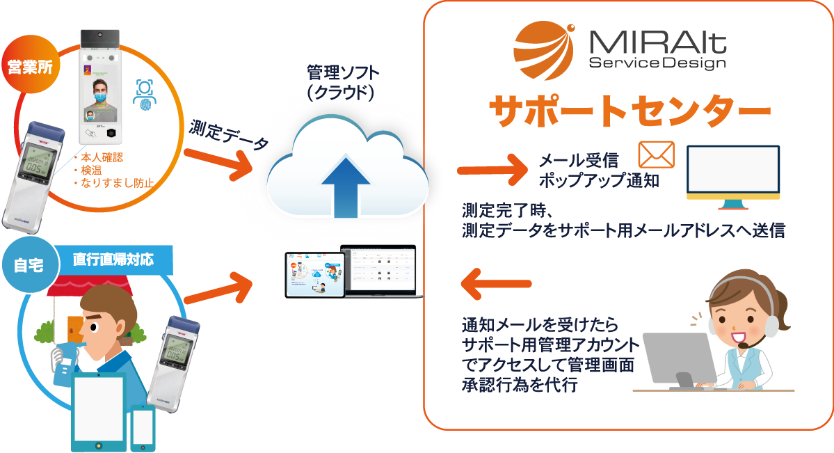 アルコール検査時のメール通知を弊社サポートセンターに設定することで、安全運転管理者の代行業務が可能です。