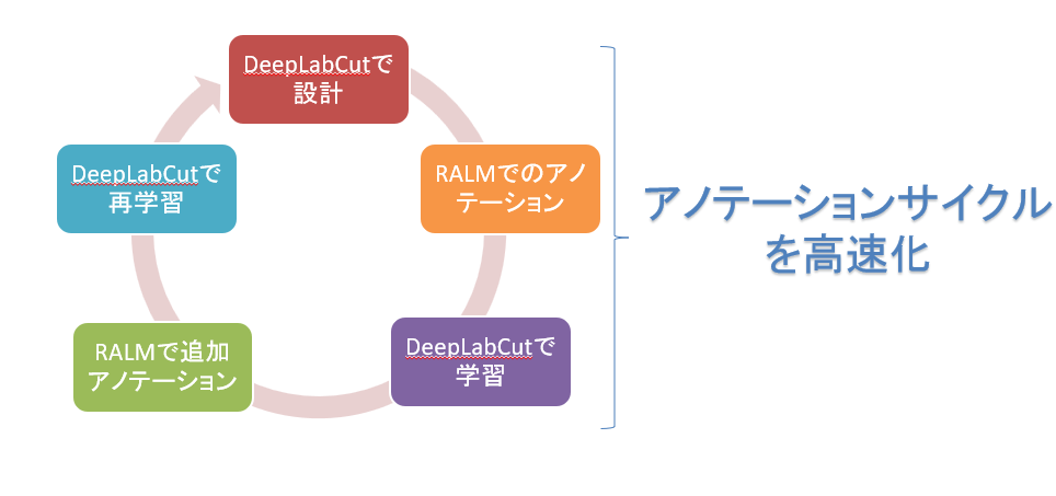 RALMはDeepLabCut利用の環境構築を行うことなくDeepLabCutのラベリングおよびラベリングチェックと修正を行うことができ、AIモデル開発精度とコストの両立をサポートします。