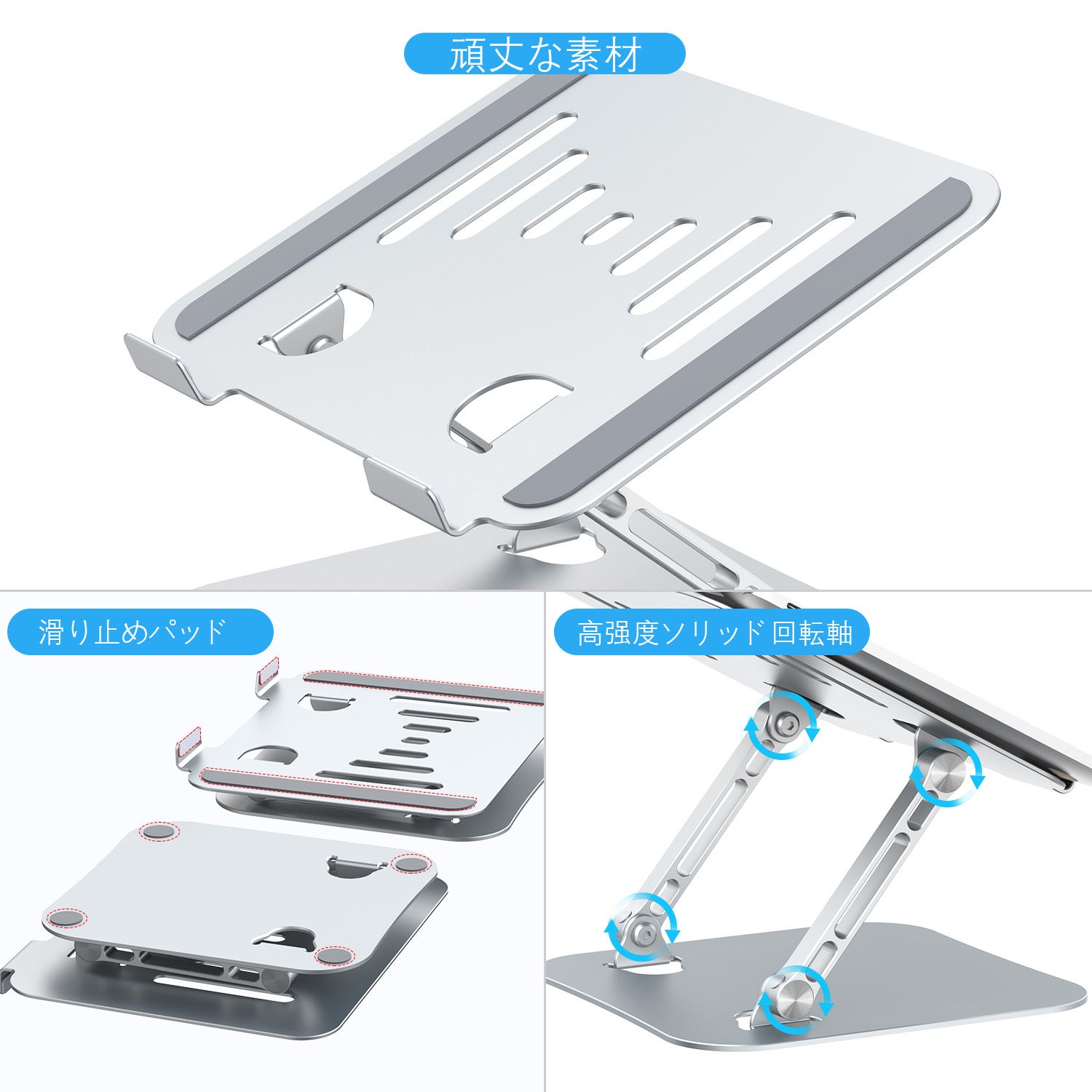 【高品質な素材&安定性優越】このパソコンスタンドの全体は高品質なアルミニウム合金を採用し、繊細な手触り、丈夫で耐久性があり、さび止めだけなく、清潔にもしやすいです。PCスタンドの底部に4つの滑り止めパッドが付いているので、パソコンの落下やパソコンスタンドの移動の心配がありません。適切な角度に調節さえすれば、タイピングはブレません。 回転軸部は耐摩耗性を向上させるアルミ処理を施し、耐摩耗性に優れ、支持力に優れています。調整には強度が必要なため、使用中に落下することがなく、安定性も抜群です。