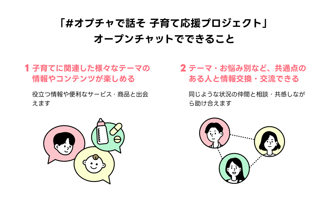 『#オプチャで話そ 子育て応援プロジェクト』は、日頃から子育てをする方々に寄り添い活動されている賛同企業・団体の公式オープンチャットを開設・運用し、“孤育て”やママ・パパの悩み、不安の解消に少しでも貢献できるよう、気軽に話せる場所を提供するプロジェクトです。