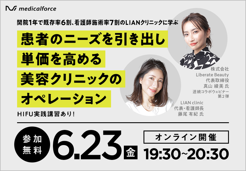 クリニックの売上を向上するため、「LTV(顧客生涯価値)を高めたい!」とお考えのクリニック経営者は多いのではないでしょうか。 美容クリニックにおけるLTVアップには、単価とリピート率の向上が大切です。 本ウェビナーでは、開院から1年で既存率6割、看護師施術率7割で、高単価なたるみ治療も人気なLIANクリニック様よりゲストをお迎えし、成功の秘訣を探ります。 スタッフ全員で一丸となり患者様にとって最適な提案をし、その上でクリニックとしても売上を上げていくための、オペレーション構築のヒントが詰まったウェビナーとなっています。 また、LIANクリニックで技術統括/看護師長を務める藤尾有紀氏によるハイフ講習の実演も実施します!