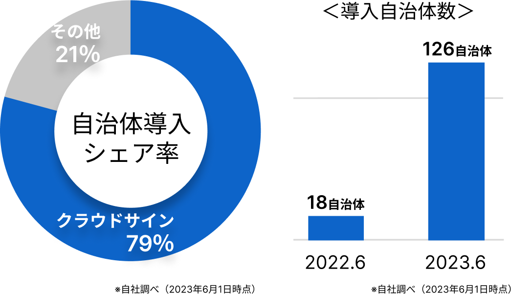また、クラウドサインは、国内の自治体における導入シェア率は80%※1となり、自治体における電子契約サービス導入数No.1※3の電子契約サービスとして、引き続き全国の電子契約化を推進してまいります。(※1)全国の自治体が公開している公募、入札、プロポーザル情報を自社で比較。2023年6月1日時点調べ。(※2)導入企業はSMBCクラウドサインなどのOEM商材含む。(※3)国内主要電子契約サービス提供5社がHP等で公表する導入自治体数を自社で比較。2023年6月1日時点調べ。