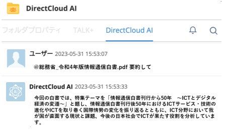 対策:ダイレクトクラウド上に保存したファイルに対して質問を投げかけると、そのコンテンツをDirectCloud AIが解析して瞬時に自然言語で回答します。数百ページあるドキュメントから必要な情報を見つけ出して回答するため、もう重たいPDFを開く必要もありません。