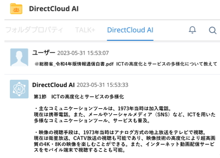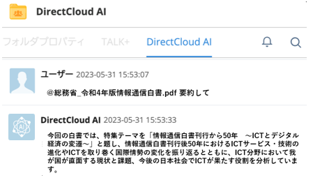 対策:ダイレクトクラウド上に保存したファイルに対して質問を投げかけると、そのコンテンツをDirectCloud AIが解析して瞬時に自然言語で回答します。数百ページあるドキュメントから必要な情報を見つけ出して回答するため、もう重たいPDFを開く必要もありません。