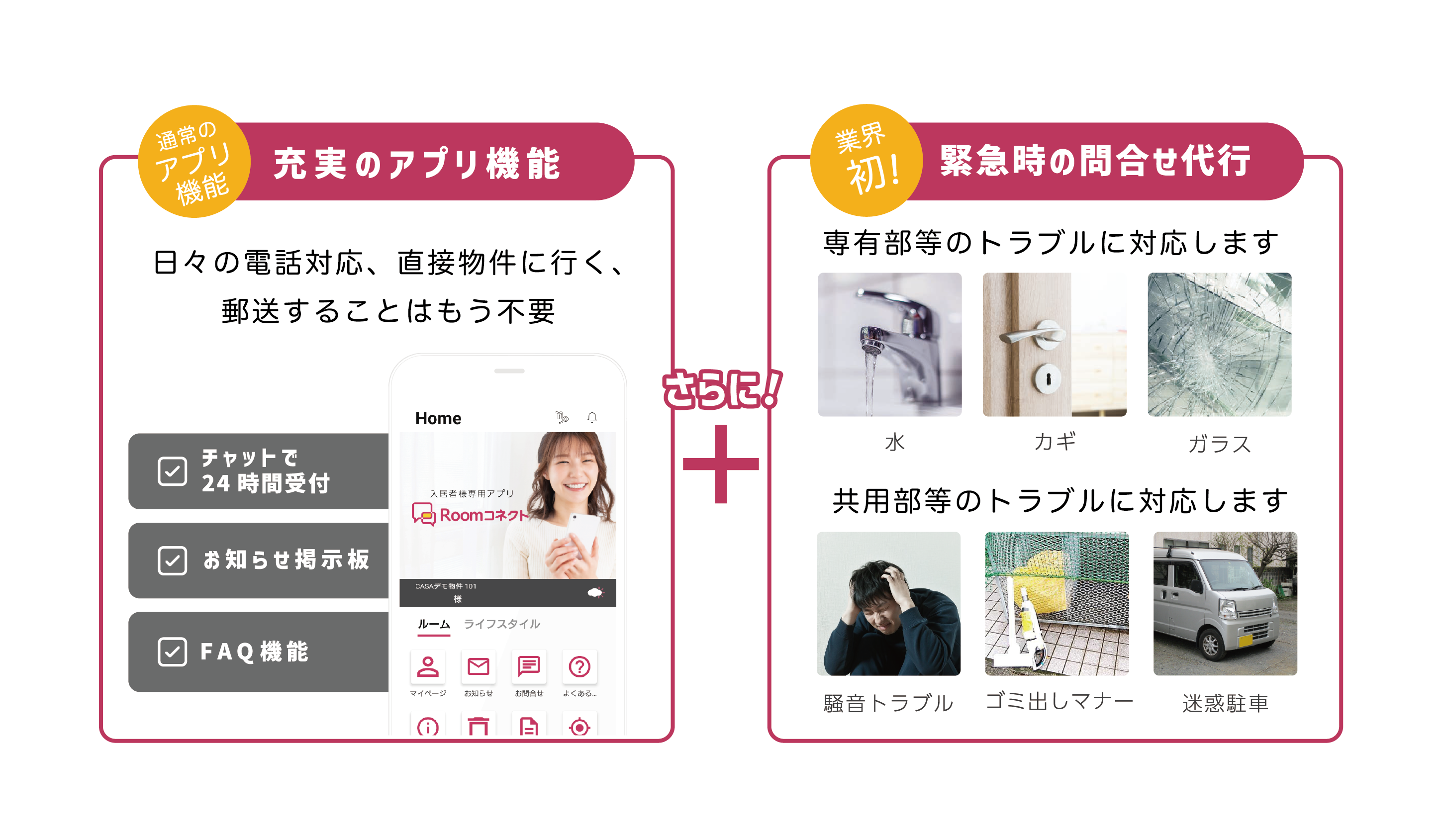 この度、不動産管理会社・不動産オーナー向けにCasaが展開する入居者からの問い合わせ対応やお知らせ配信、掲示板機能をパッケージ化したサービス「Roomコネクト」と連携した、「近隣トラブルへの対応サービス」を共同開発いたしました。