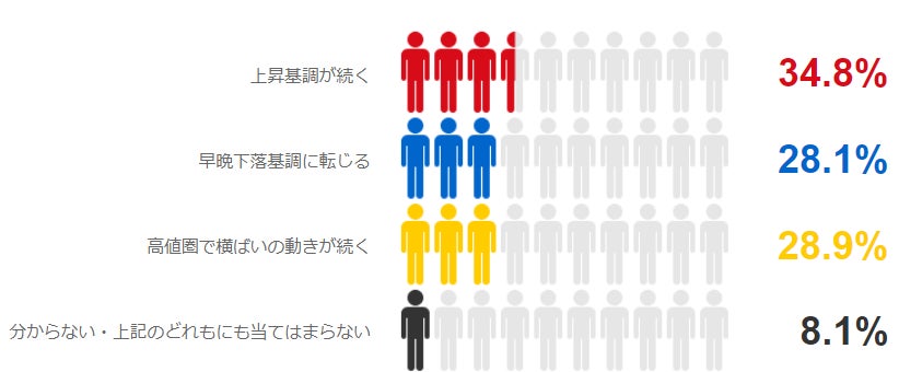 今回は、ある意味でかなり大雑把な選択肢から回答を選んでいただいた。「上昇が続く」「早晩下落基調に」「高値圏で横ばい」が、きれいに3つに分かれたこと自体が印象的だ。