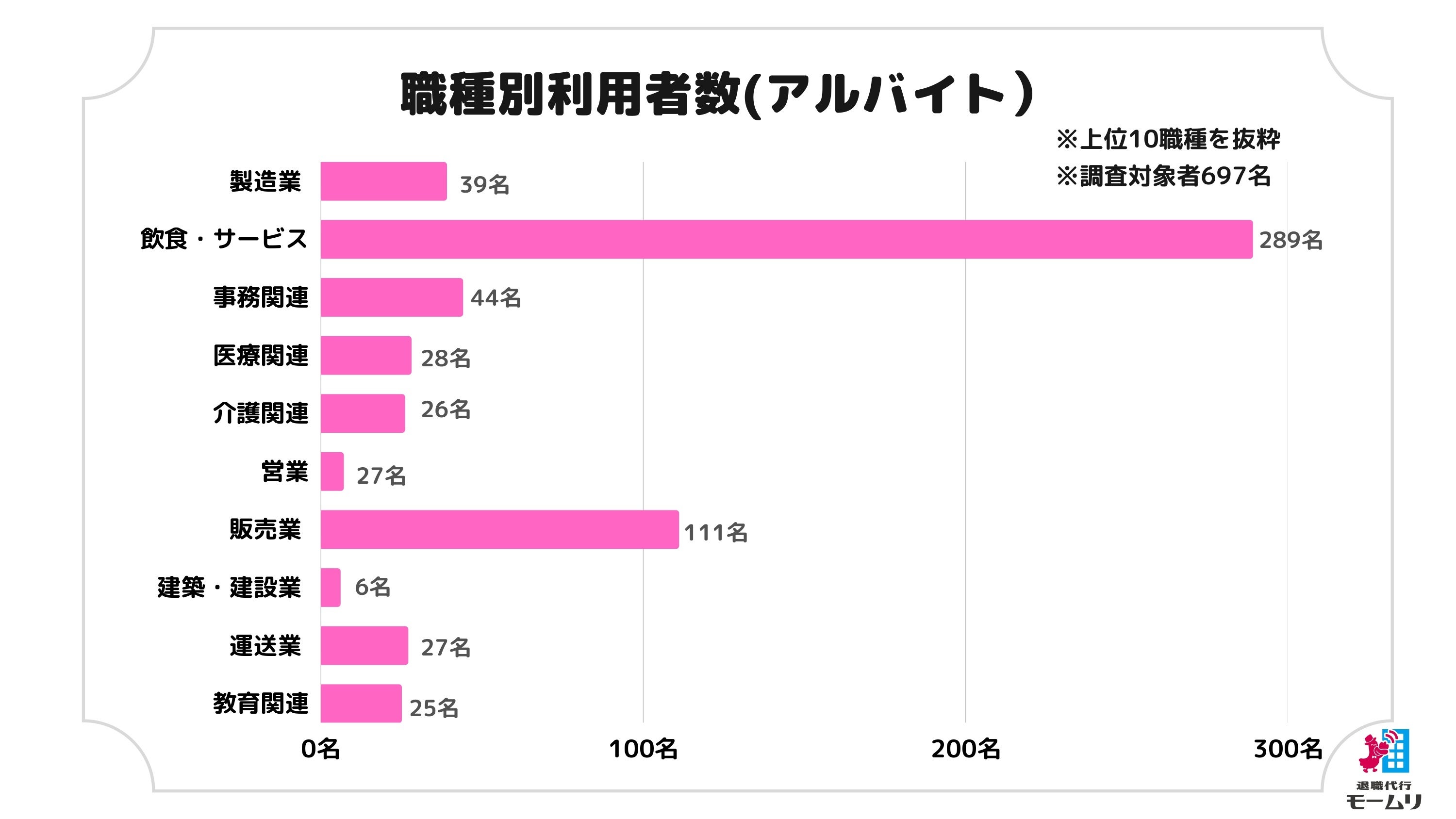 正社員では、製造業が123名(正社員の13.1%)と一番多く、アルバイトでは飲食・サービス業が289名(アルバイトの41.5%)と群を抜いて多い結果でした。