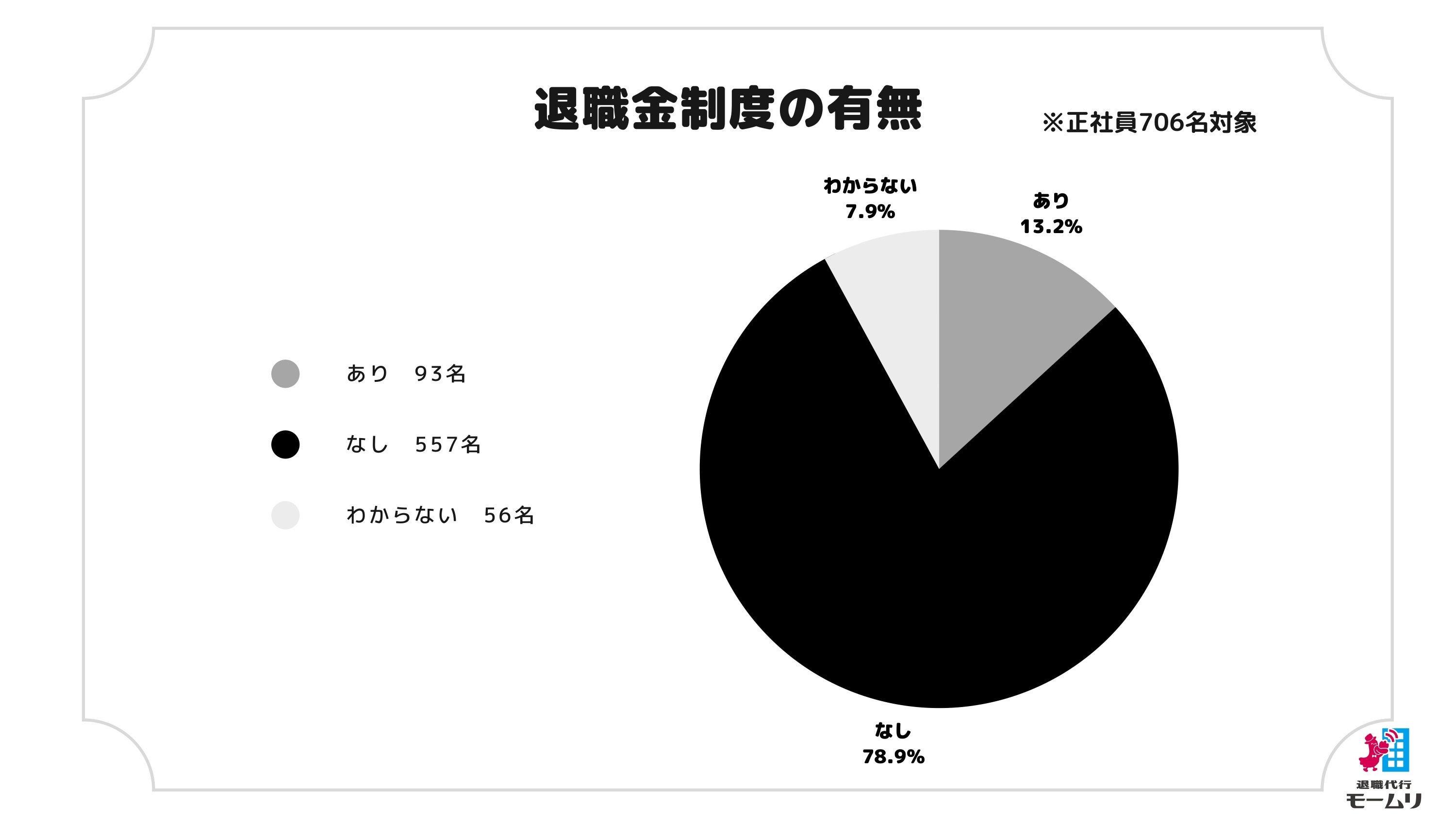 退職金が「ある」と答えた方は正社員706名中わずか13.2%とかなり少ないです。