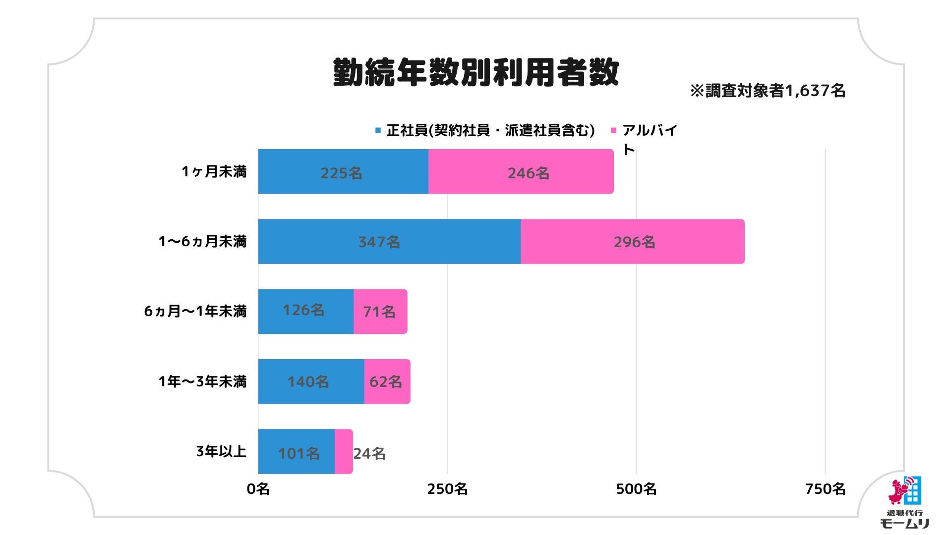 退職代行利用者の勤続年数を雇用形態別に集計しました。