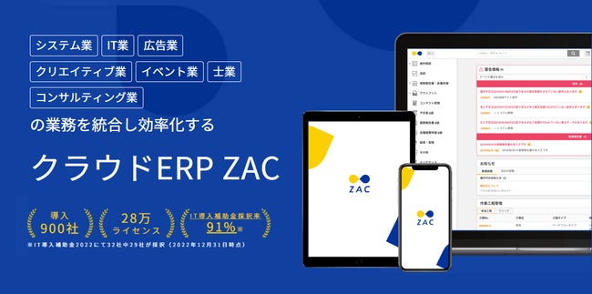 クラウドERP「ZAC」は損益管理、プロジェクト管理、管理会計、内部統制、決算早期化を実現する統合型の基幹業務システムです。業務効率化と的確な経営判断を支援し、企業の継続的な成長を担う経営基盤として、IT業、システム業、広告業・クリエイティブ業、士業、コンサルティング業をはじめとした累計900社を超える企業様に導入いただいております。モジュール(機能)単位で導入範囲やライセンス数を選択でき、導入後も必要に応じて機能やライセンスの追加が可能であることも特徴です。