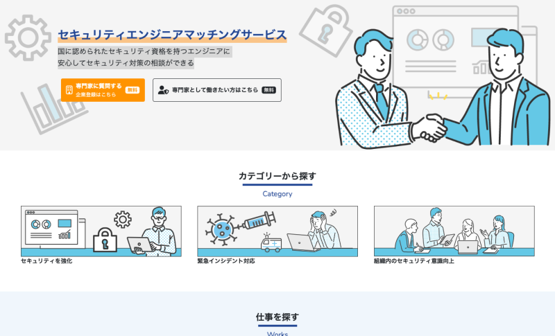 セキュリティエージェントは、国に認められたセキュリティ資格(情報処理安全確保支援士(登録セキスペ))を持つエンジニアのみが登録できるサービスで、セキュリティ対策をしたいが「何をしたらよいかわからない」「誰に相談したらよいかわからない」という専門家が社内にいない中小企業でも、安⼼してセキュリティ対策の相談ができる、企業とセキュリティ専門家がマッチングできるサービスです。