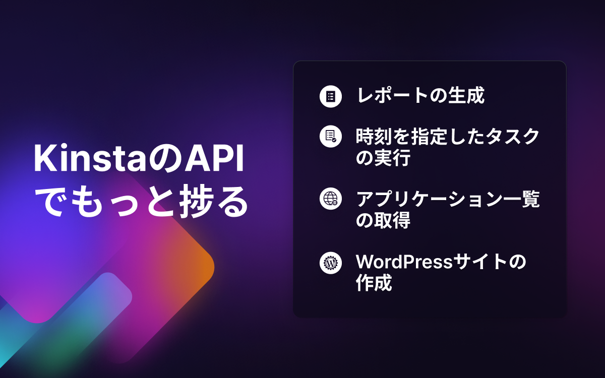 KinstaのAPIを利用することで、Kinstaホスティング環境へのアクセスが今まで以上に簡単になります。レポートの生成、時刻やタイミングを指定したタスクの実行という日常的な業務から、通常であれば手動での操作が伴うWordPressサイトの作成まで、数々の作業をAPI経由でよりスムーズに実行することができます。