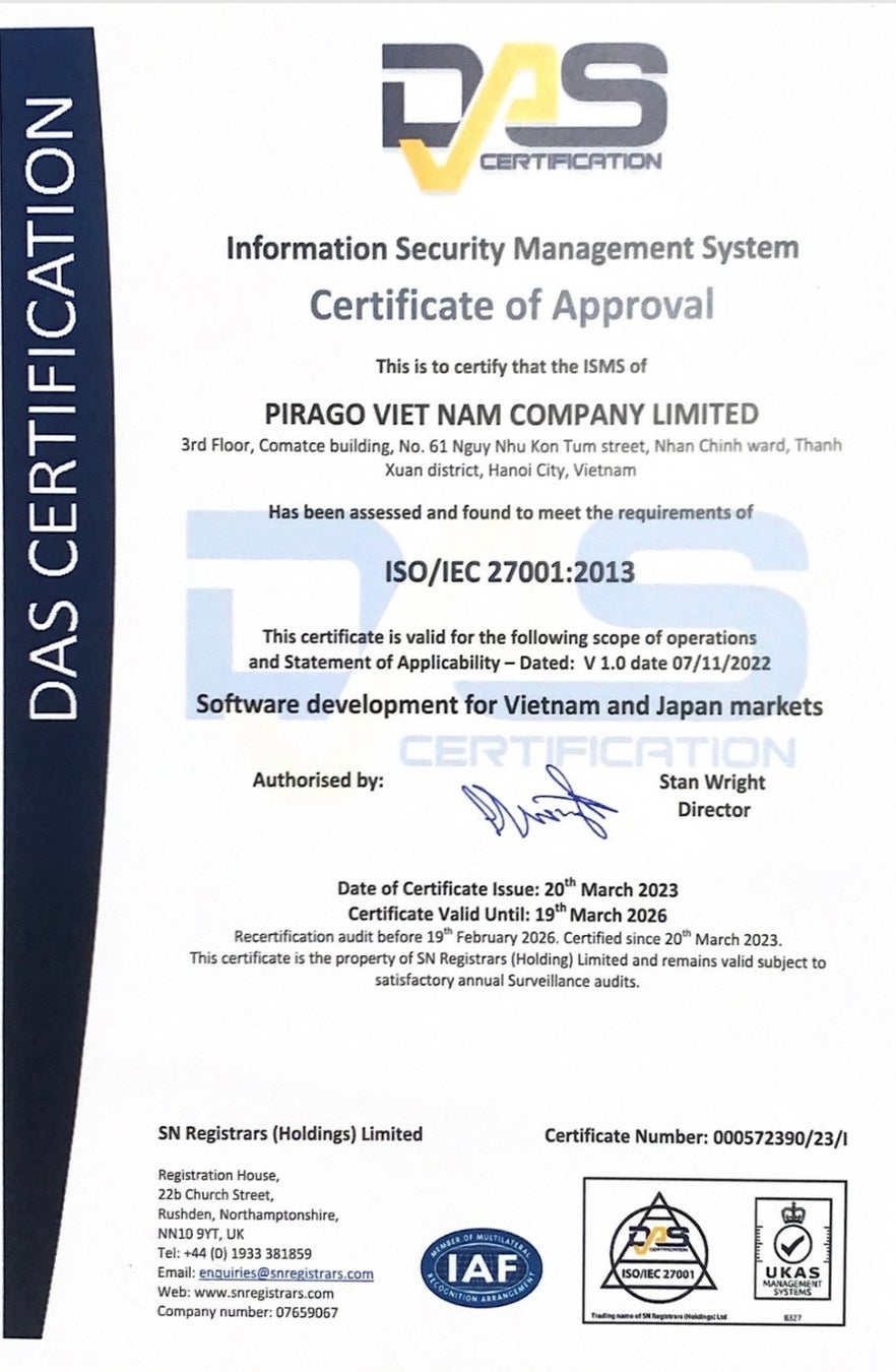 ▶︎PiraGoのオフショア開発の詳細:https://pirago.vn/ja/service/
