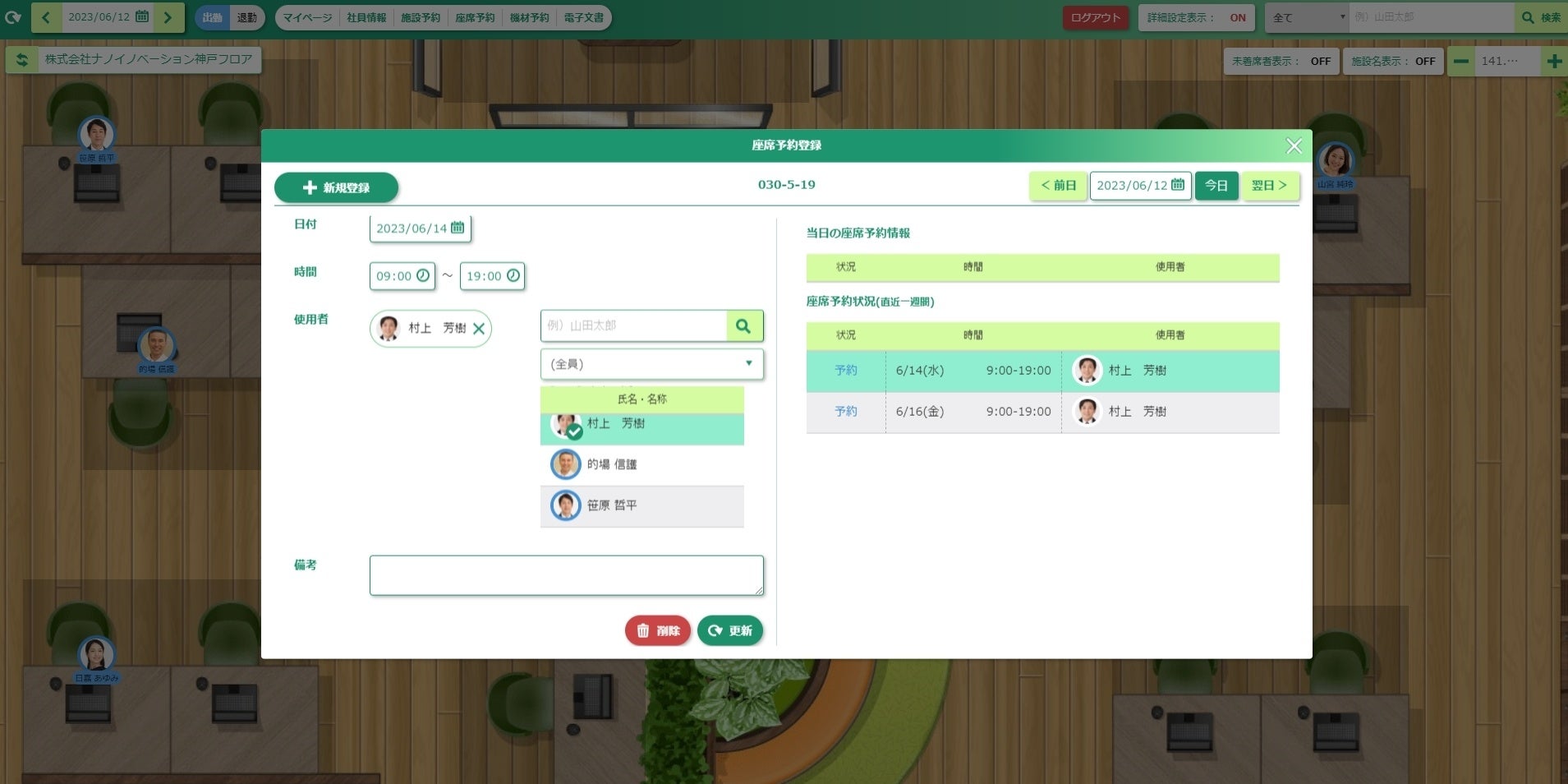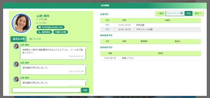 ▲リアルワーク・リモートワーク問わず社員が相互に勤務状況を確認でき、その情報を元にオンライン上での伝言メモやボイスチャット、Web会議を実施可能。