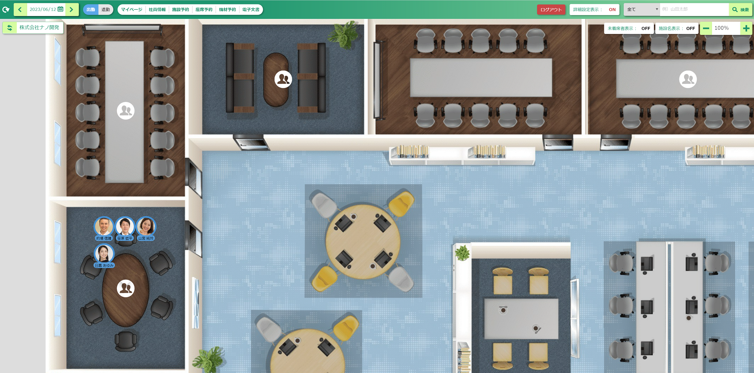 フロアレイアウト上には人の状況はもちろん、施設や機材など、あらゆるマテリアルの状況を表示することができます。