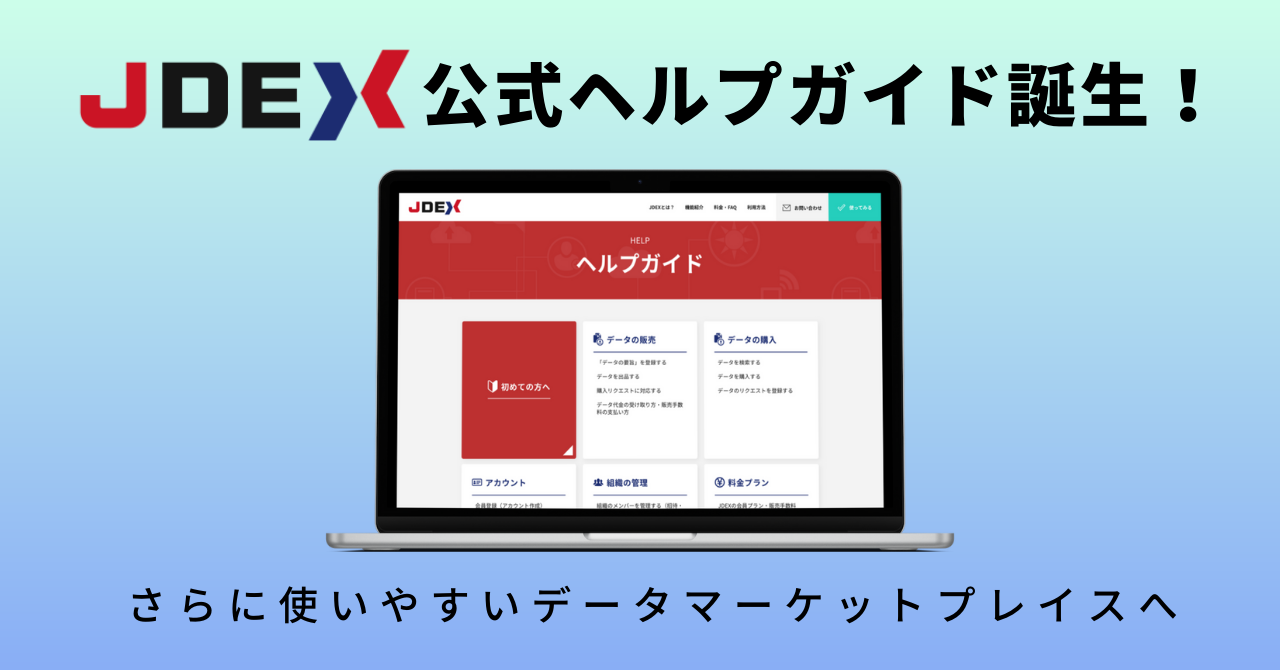 株式会社日本データ取引所(本社:東京都渋谷区、代表取締役:森田直一、以下当社)は、自社が運営するデータマーケットプレイス「JDEX®︎」において、初の公式ヘルプガイドを公開いたしました。
