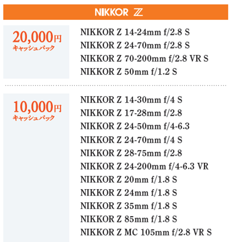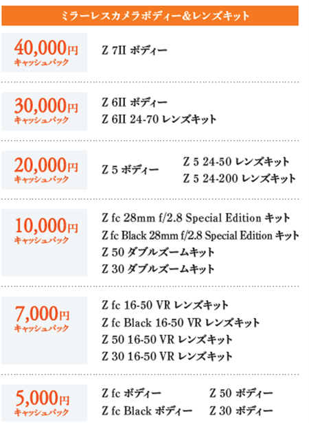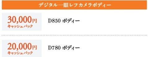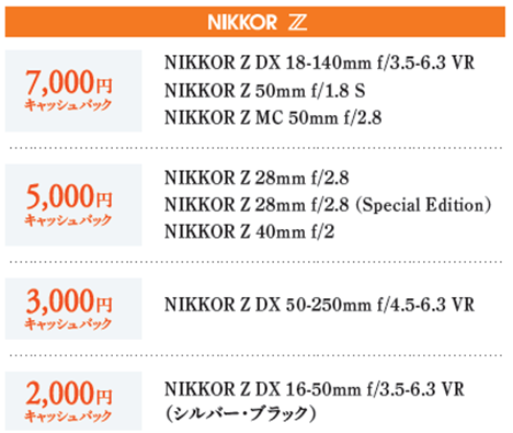 内 容:対象製品ご購入期間中に対象製品を購入し、ニコンイメージング会員の登録並びに製品登録※1の上、所定の応募用紙に必要書類を揃えて応募された方全員にキャッシュバック※2いたします。