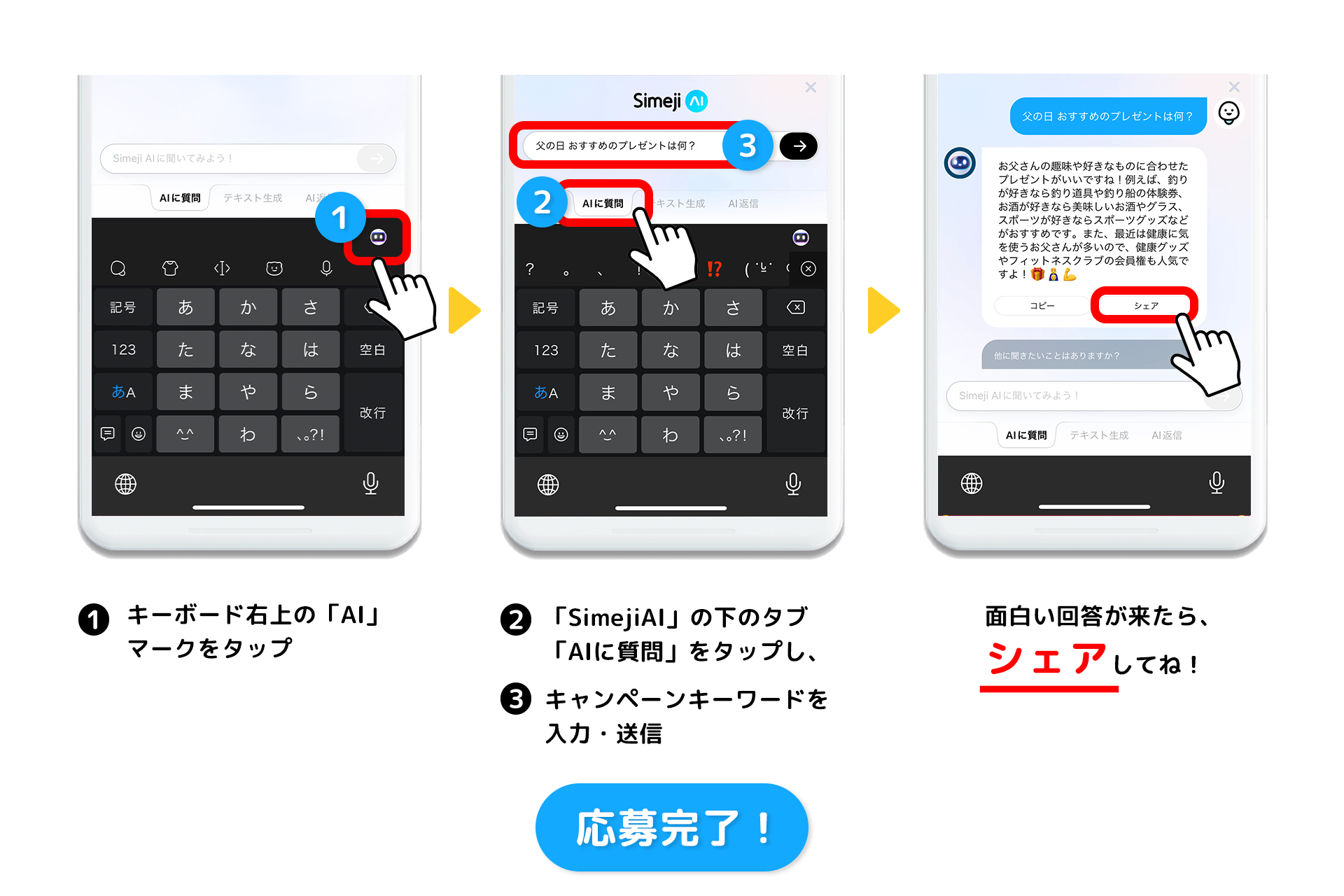 3)「AIに質問」で以下のキーワードのうち2つ以上を入力して質問を送信。(応募完了)