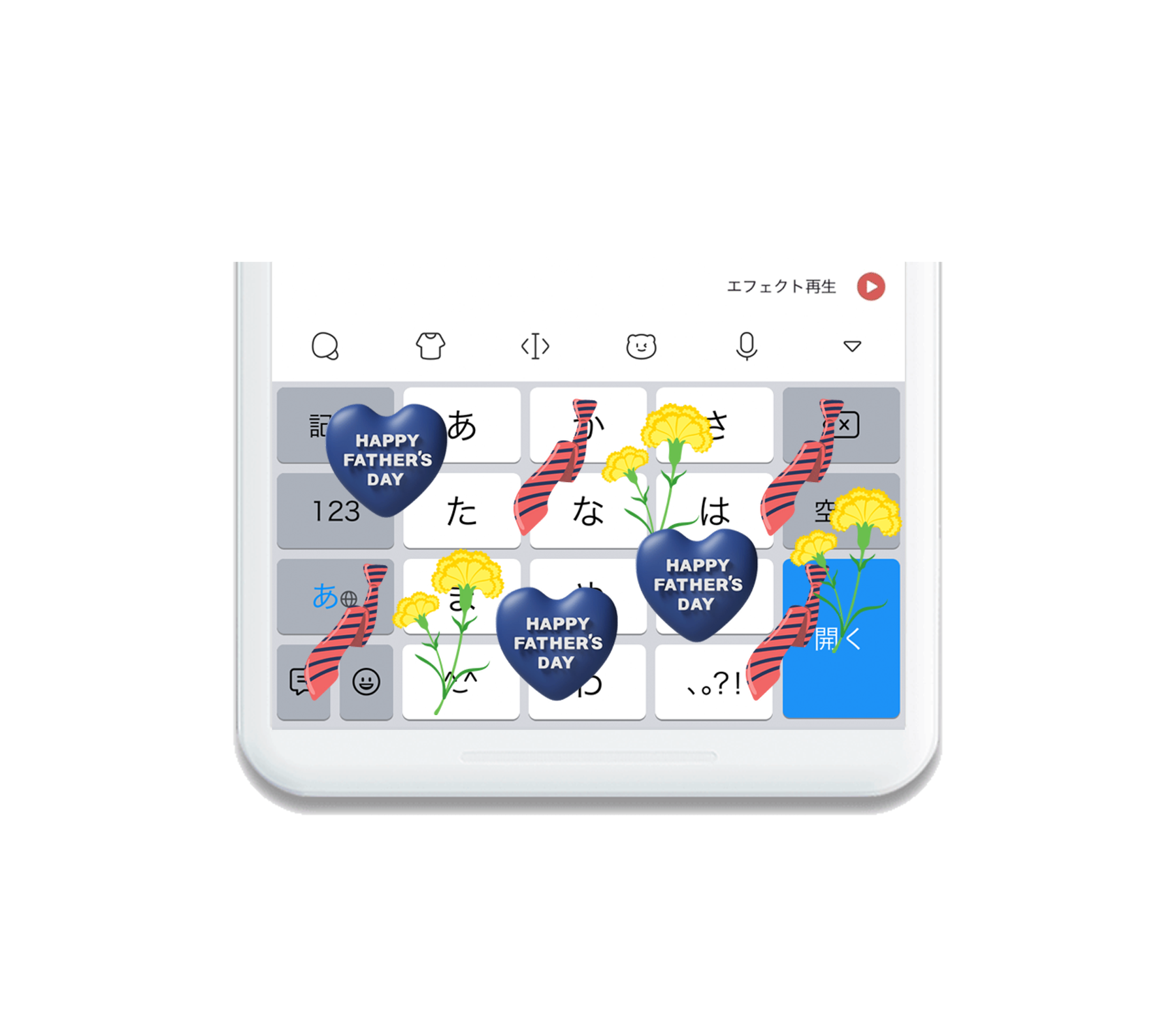 ユーザーが文字を入力し、変換候補より特定のキーワードを選択することで画像や動画がキーボード上に現れる機能です。本キャンペーンでは特定のキーワード「父の日」、「お父さん」、「ありがとう」などによってエフェクトが再生されます。父の日ならではのエフェクトをお楽しみください。