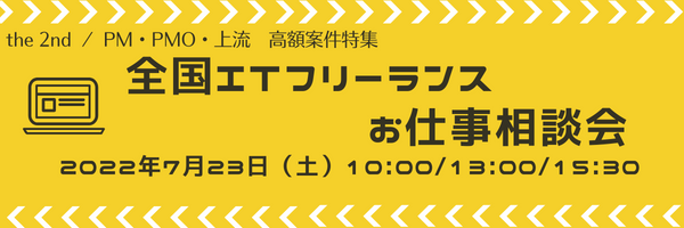 今回で二回目となる本イベントは、全国のITフリーランスの方々が自分にあった案件や働き方を見つけるために開催されるお仕事相談会です。第一回目は、フルリモート案件の紹介に特化した形で開催されました。第二回目となる今回は、PM・PMO・上流といった高額案件の紹介に特化した形で開催いたします。