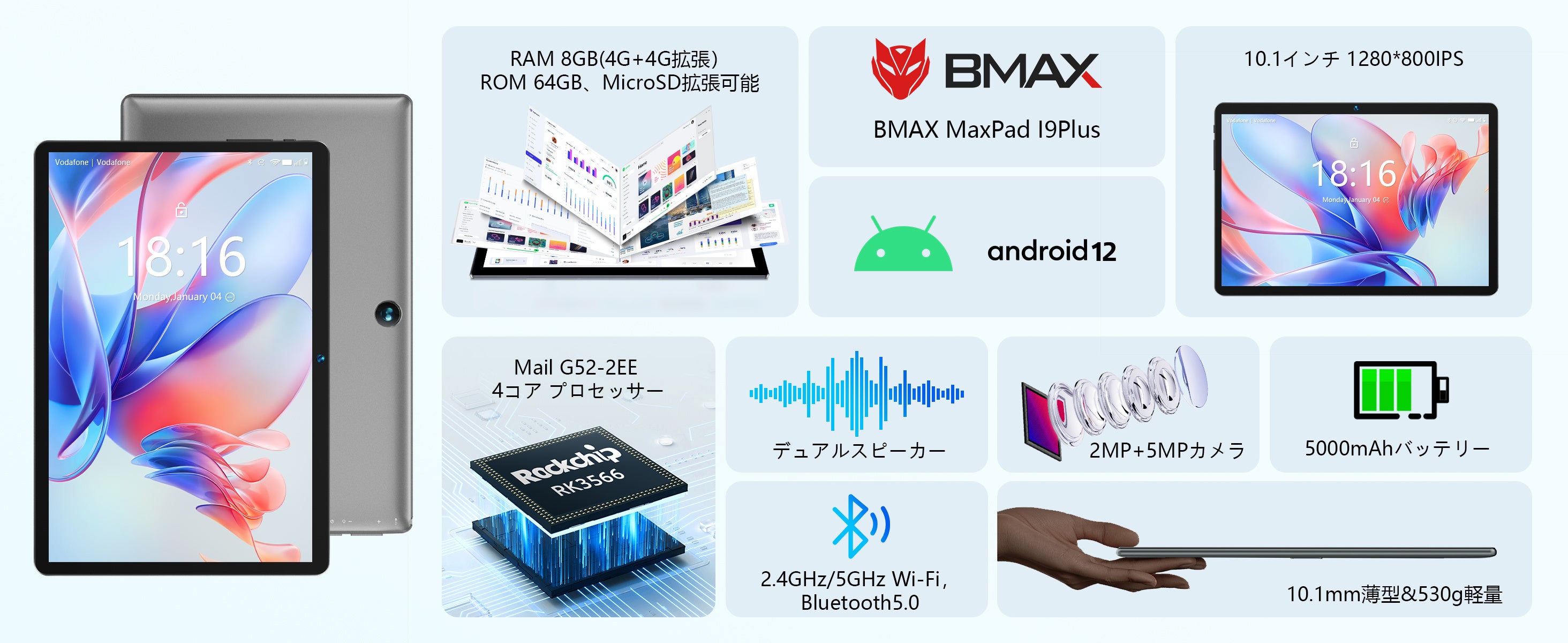 BMAX I9Plus タブレットは最新のAndroid 12 システムを搭載しています。 元の Android 11 システムと比較して、より安定した動作能力を備えています。 元の 4GB+64GB メモリから現在の 8GB+64GB メモリに拡張します。 収納スペースが大きくなったので、生活に残しておきたい写真、音楽、電子書籍をより多く保存できます。