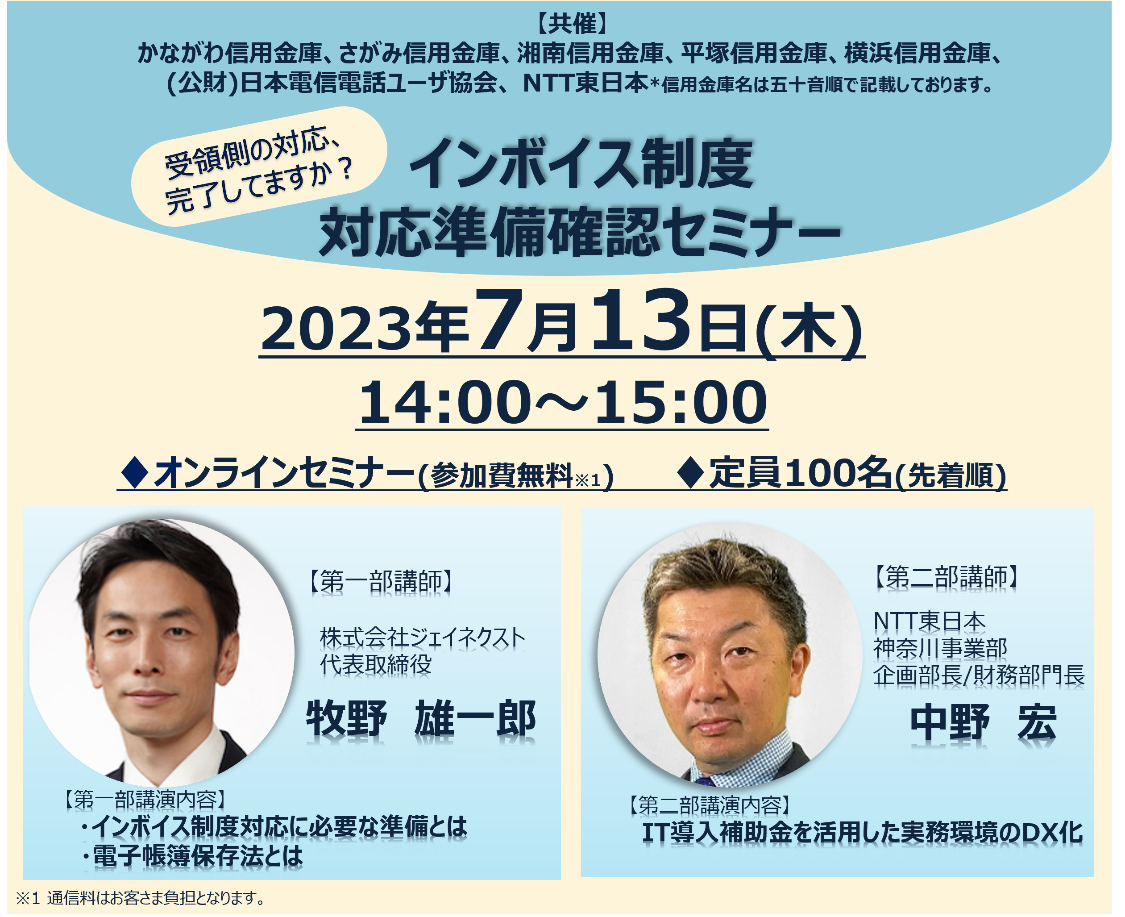 NTT東日本 神奈川事業部は、かながわ信用金庫・さがみ信用金庫・湘南信用金庫、平塚信用金庫、横浜信用金庫、日本電信電話ユーザ協会と共に、インボイス制度と電子帳簿保存法への対応に関するオンラインセミナーを開催します。