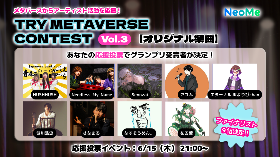 メタバースからアーティストを応援する「TRY METAVERSE コンテスト~オリジナル楽曲動画募集~」の応援投票が開始! 期間中のユーザー応援投票で、一次審査を通過したファイナリスト9組の中からグランプリ受賞者1組を決定します。受賞者には渋谷エリアの街頭ビジョンでの動画放映権を授与。みんなで投票に参加して、好きなアーティストを応援しよう!