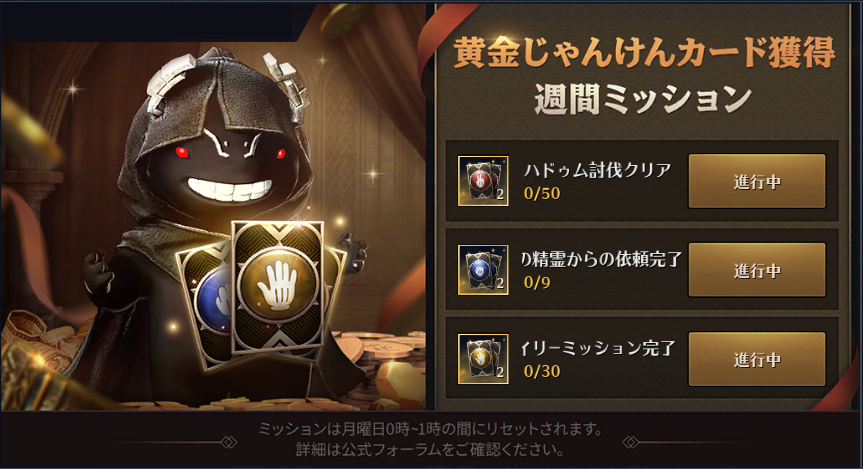 イベント期間中、ミッションをクリアすると、「闇の精霊と対決!じゃんけんぽん」イベントで通常より豪華な報酬が獲得できるかもしれない「黄金」じゃんけんカードを獲得することができます。詳細は以下URLをご確認ください。