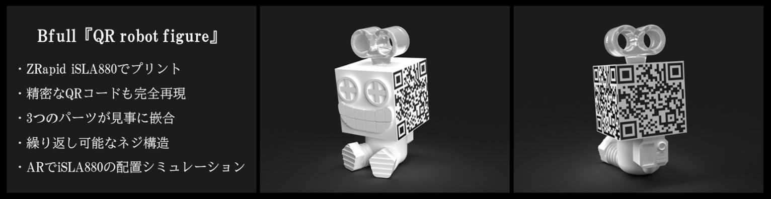 Bfull「QR robot figure」」は、ZRapid iSLA880 by B’fullで生産したノベルティで、寸法精度や材質を確認いただける仕様になっており、QRコードの精密な印刷・3種のパーツの嵌合、繰り返し可能なネジ構造などを備えています。QRコードにアクセスすることでARでZRapid iSLA880 by B’fullの配置シュミレーションが可能です。