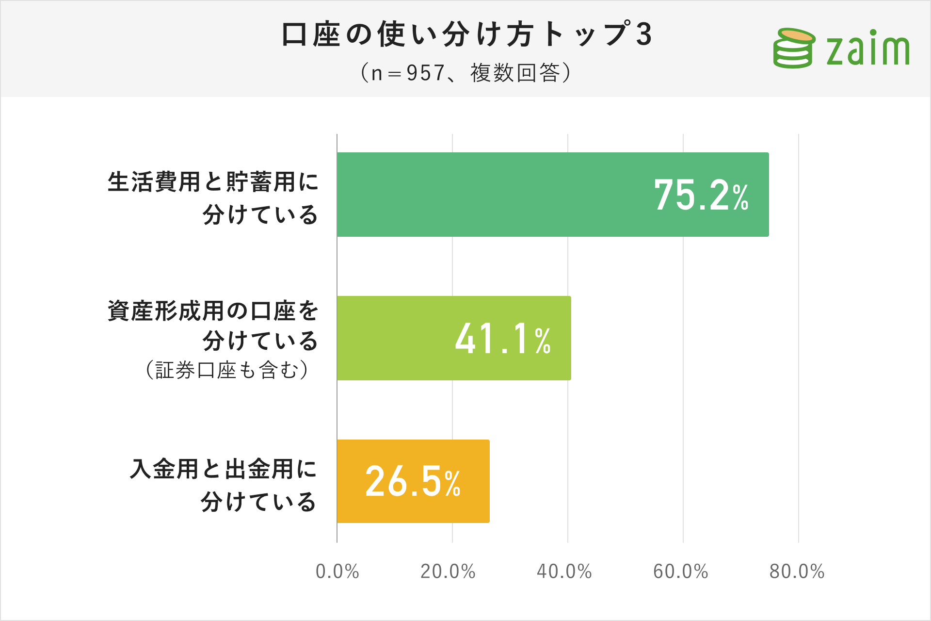 複数口座の使い分けについて聞いたところ、第 1 位が「生活費用と貯蓄用に分けている」 75.2% となり、生活費とは別に貯蓄用口座をつくることで、「貯蓄金額を把握しやすい」、さらには「毎月の貯蓄額の変動が目に見えてモチベーションアップに繋がる」といった回答がみられました。第 2 位が「資産形成用の口座を分けている(証券口座含む)」41.1%となり、生活に必要な分以外は投資用口座に入金するなど、「使う」「貯める」だけでなく「増やす」ことへの関心の高さがうかがえました。第 3 位が「入金用と出金用に分けている」26.5% となり、日々の支出額を把握しやすくしたり、カードの引き落としでポイントが貯まる銀行を出金用にするなど工夫している人もいました。