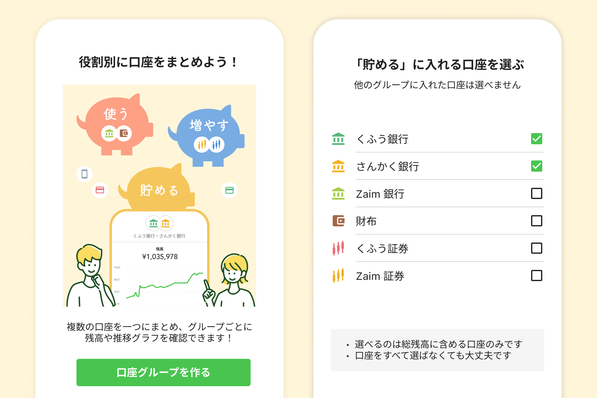 「使う」「貯める」「増やす」といった役割別に口座を分類し、それぞれの合計額や推移を一目で確認することができます。「現金でいくら貯められているか」「投資分がいくらあるか」など、家計全体の状況が把握しやすくなり、計画的な支出管理や資産形成をサポートします。それぞれの口座グループの名称は、用途に応じて変更したり、追加することができます。