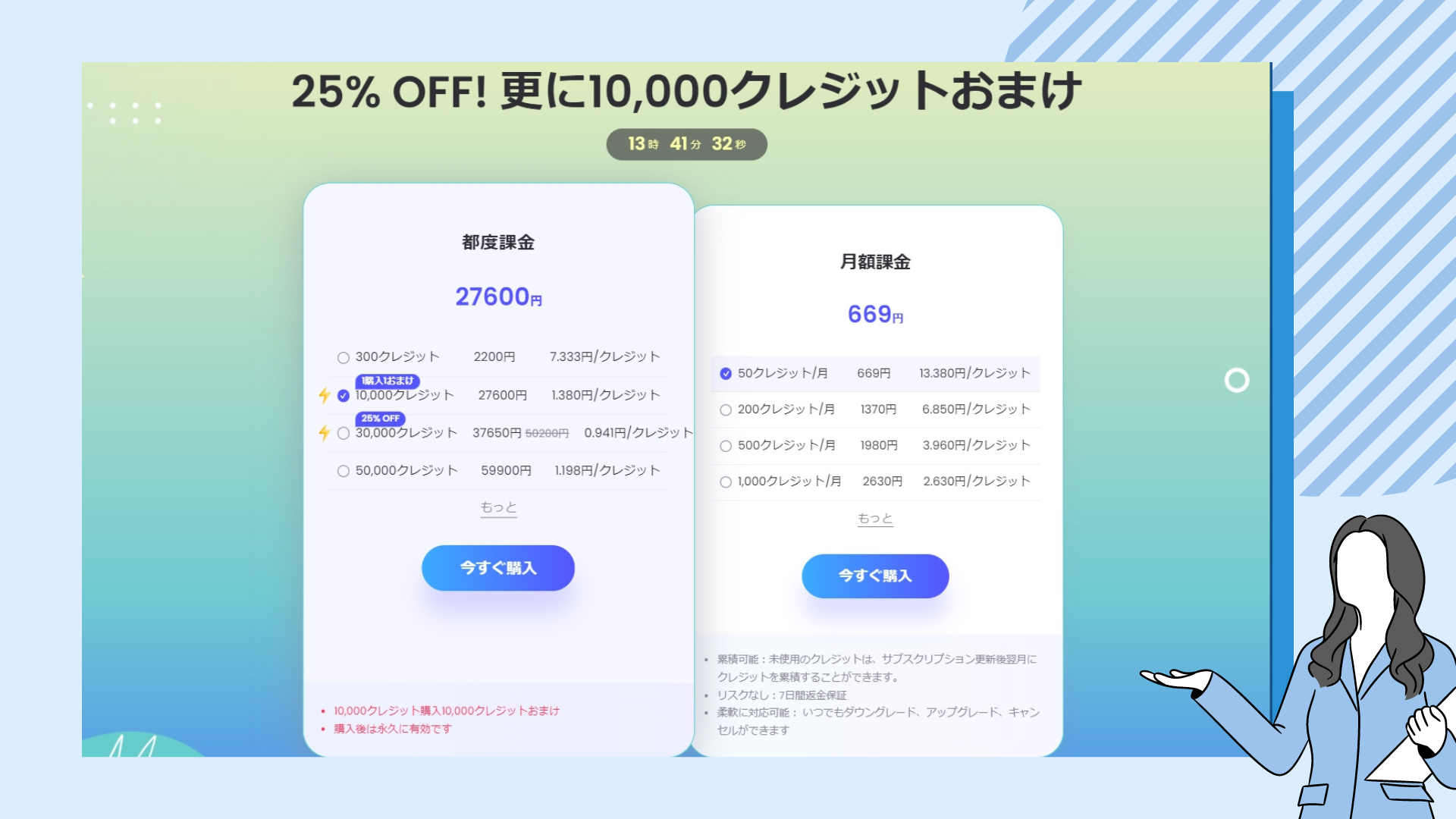 10,000クレジットを購入すると、もう10,000クレジットが無料でプレゼントされます。